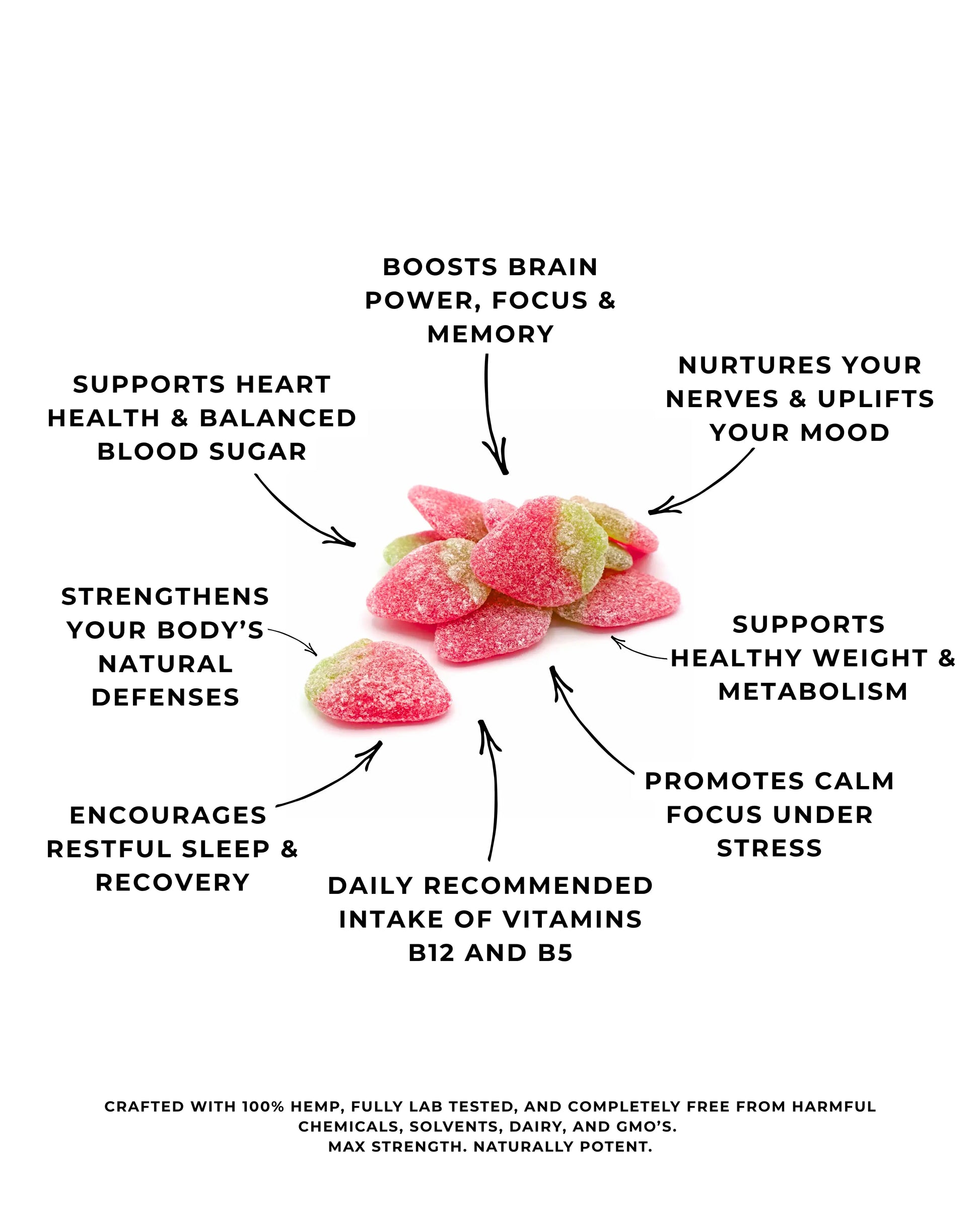 Lion's Mane Extract, Vitamin B5 (Pantothenic Acid), Vitamin B12 (Cyanocobalamin), Glucose Syrup, Acidifiers (Citric Acid, Malic Acid), Gelling Agent (Pectin), Fruit Juice Concentrate (Apple 1%), Natural Flavours (Strawberry), Black Carrot JUICE, Spirulina Concentrate & Turmeric.